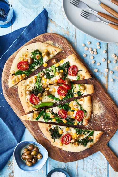 Pinsa bianca mit gerösteten Süßlupinen, Bimi und getrockneten Tomaten
